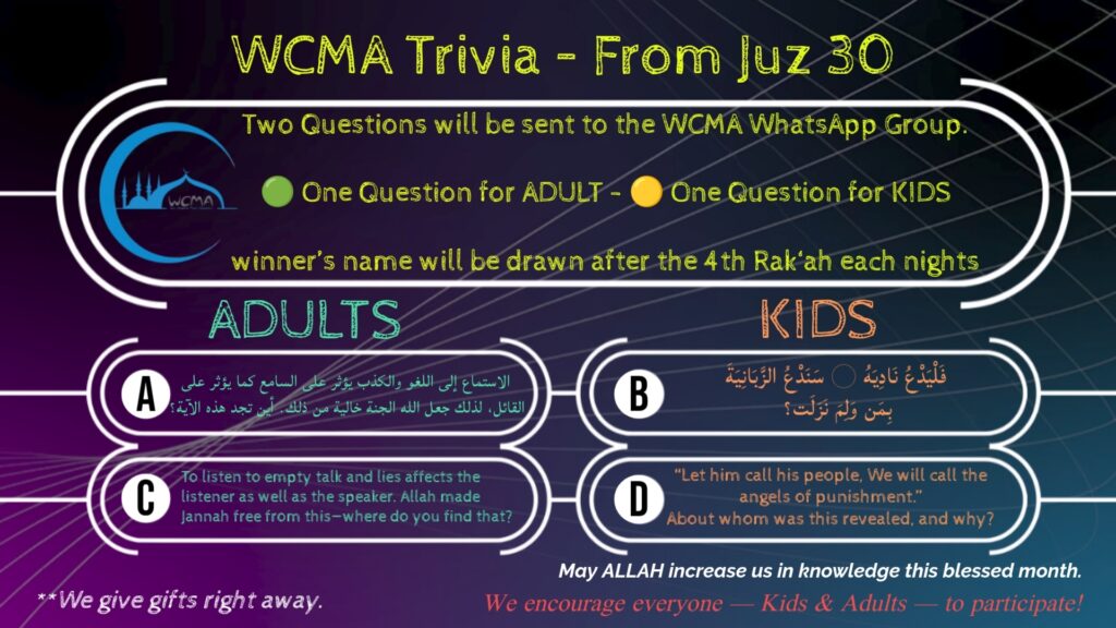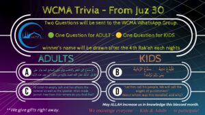Join the WCMA Last 10 Nights CampaignPromoting your business within our community. Your generous donation will significantly impact the Quran Memorization program at the Al-Quds Devotion School.